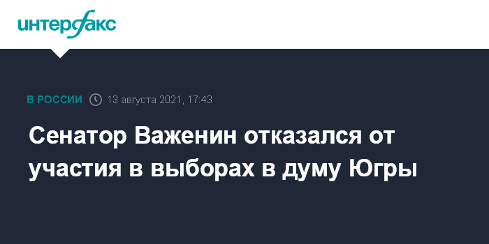 Москва. 13 августа. INTERFAX.RU - Сенатор Юрий Важенин - бывший глава ООО "Газпром переработка" - подал заявление об отказе от участия в выборах в думу Ханты-Мансийского автономного округа - Югры, избирком региона по этому заявлению исключил его из списка кандидатов от "Единой России". Об этом сообщила пресс-служба комиссии.