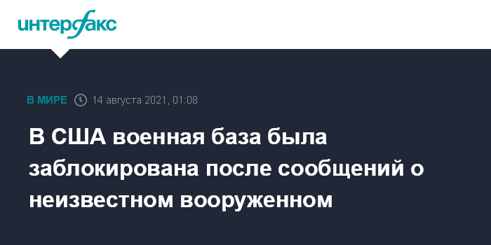 Москва. 14 августа. INTERFAX.RU - Военная база в Вашингтоне была заблокирована на полтора часа в пятницу после того, как вооруженный человек появился на ее территории, сообщает Associated Press.