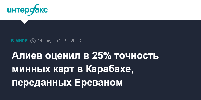 Москва. 14 августа. INTERFAX.RU - Точность минных карт в Карабахе, переданных Арменией, составляет всего 25%, заявил президент Азербайджана Ильхам Алиев.