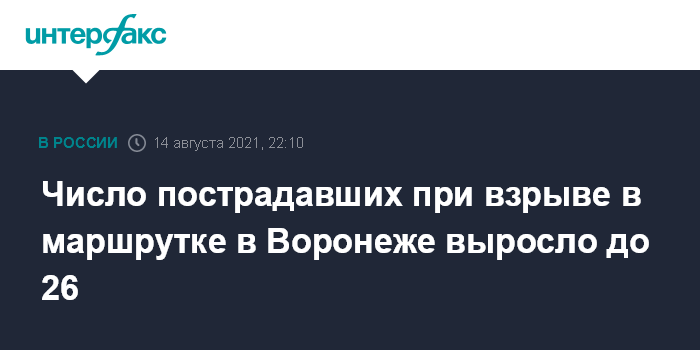 Москва. 14 августа. INTERFAX.RU - Еще трое пострадавших при взрыве в маршрутке в Воронеже обратились за медицинской помощью, их количество выросло до 26, сообщил региональный департамент здравоохранения.