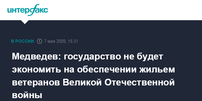 Как отметил глава государства, забота о ветеранах является обязанностью государства и экономить на этом нельзя. "Государство будет это делать. Здесь не должно быть разговоров об экономии, какие бы кризисы, в том числе экономические, ни переживала наша страна и весь мир. На таких расходах экономить государство не будет!" - пообещал Медведев.