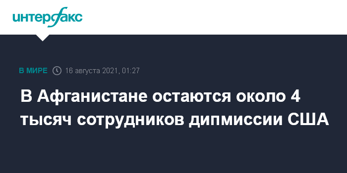 Москва. 16 августа. INTERFAX.RU - Афганистан к настоящему моменту покинули порядка 500 сотрудников посольства США в Кабуле, и там остаются порядка 4 тысяч американских и афганских сотрудников дипмиссии США, сообщает CNN со ссылкой на источники в военных кругах.