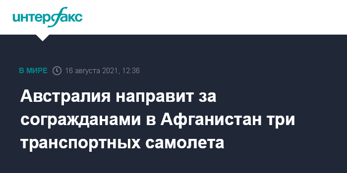 Москва. 16 августа. INTERFAX.RU - Власти Австралии направят в Афганистан три военно-транспортных самолета, как минимум один самолет-топливозаправщик и 250 военных, чтобы вывезти своих граждан из этой страны, а также помогавших им афганцев, сообщает Sydney Morning Herald.