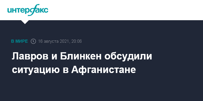 Москва. 16 августа. INTERFAX.RU - Глава МИД РФ Сергей Лавров и госсекретарь США Энтони Блинкен в понедельник ходе телефонного разговора обсудили ситуацию в Афганистане.