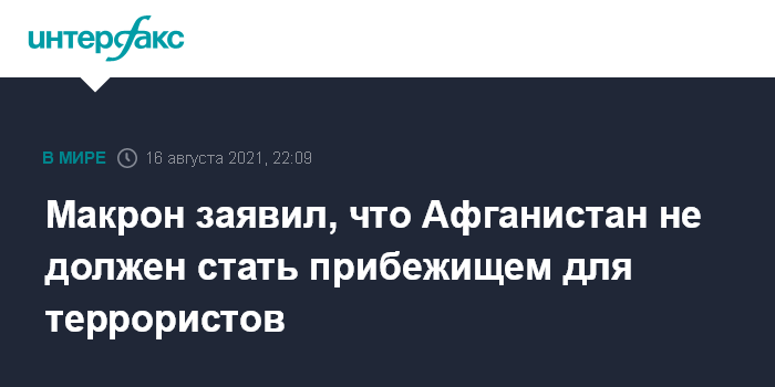 Москва. 16 августа. INTERFAX.RU - Президент Франции Эммануэль Макрон в понедельник заявил, что нельзя допустить, чтобы Афганистан, власть в котором захватило движение "Талибан" (запрещено в РФ), вновь стал прибежищем для террористических группировок.