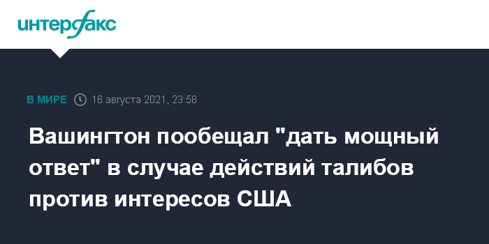 Москва. 16 августа. INTERFAX.RU - Президент США Джо Байден заявил, что в случае, если боевики движения "Талибан" (запрещено в РФ) будут предпринимать действия, направленные против американских интересов, то Вашингтон даст мощный ответ.
