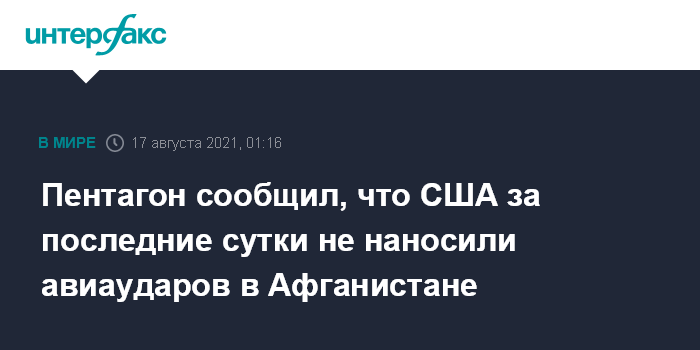Москва. 17 августа. INTERFAX.RU - Боевая авиация США за последние сутки не наносила ударов в Афганистане, однако способна делать это, если потребуется, заявили в Пентагоне.