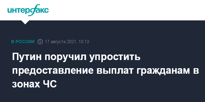 Москва. 17 августа. INTERFAX.RU - Президент РФ Владимир Путин поручил правительству до 1 сентября подготовить поправки в законодательство, упрощающие процедуру единовременных выплат гражданам, пострадавшим в результате чрезвычайных ситуаций (ЧС) природного характера.