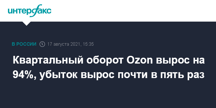 Москва. 17 августа. ИНТЕРФАКС - Оборот компании Ozon (GMV), включая услуги, по итогам II квартала 2021 года составил 89 млрд рублей, показав рост год к году на 94%, сообщила компания. Убыток Ozon по итогам отчетного квартала составил 15,23 млрд рублей против 3,29 млрд рублей убытка годом ранее.