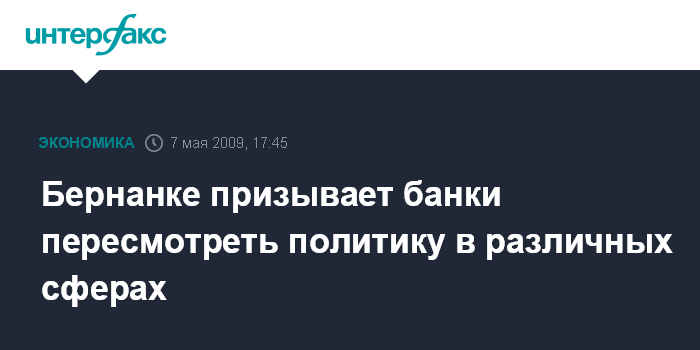 Чикаго. 7 мая. INTERFAX.RU - Американским банкам необходимо пересмотреть свою политику в различных сферах - от выплаты вознаграждений сотрудникам до риск-менеджмента, заявил глава Федеральной резервной системы (ФРС) США Бен Бернанке.