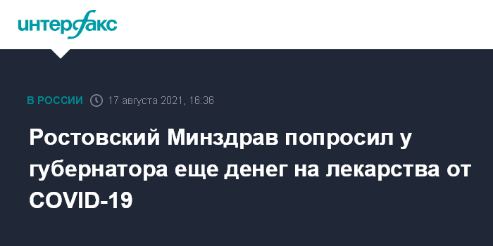 Москва. 17 августа. INTERFAX.RU - Глава Минздрава Ростовской области Юрий Кобзев попросил губернатора Василия Голубева выделить больше денег на закупку лекарств пациентам с COVID-19 из-за их возможного дефицита в начале сентября. Министр сказал об этом на заседании оперштаба 17 августа.