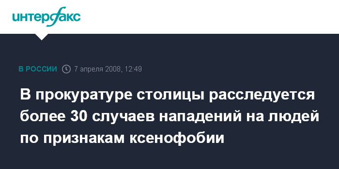 Москва. 7 апреля. INTERFAX.RU - В настоящее время столичные прокуроры расследуют более 30 случаев нападений на людей по признакам ксенофобии, заявил прокурор Москвы Юрий Семин на брифинге в понедельник.