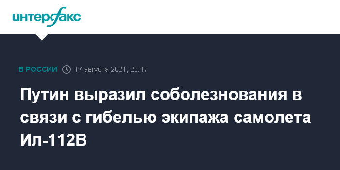Москва. 17 августа. INTERFAX.RU - Президент России Владимир Путин выразил соболезнования родным и близким летчиков, погибших при крушении самолета Ил-112В, сообщает сайт Кремля во вторник.