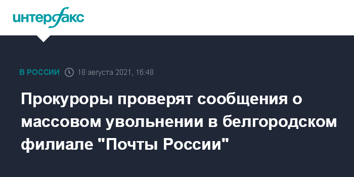 Москва. 18 августа. INTERFAX.RU - Прокуратура Белгородской области поводит проверку по публикациям в интернете о сокращении десятков сотрудников белгородских почтамтов, сообщает пресс-служба ведомства.