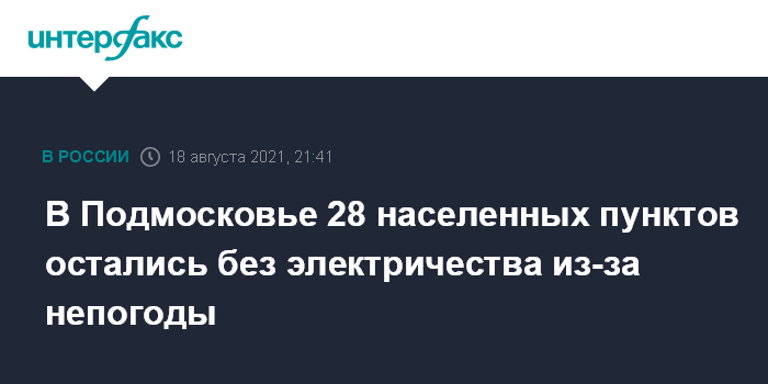 Москва. 18 августа. INTERFAX.RU - В 28 населенных пунктах Московской области отключено электроснабжение из-за последствий грозы, сопровождавшейся сильными порывами ветра, сообщил "Интерфаксу" информированный источник.