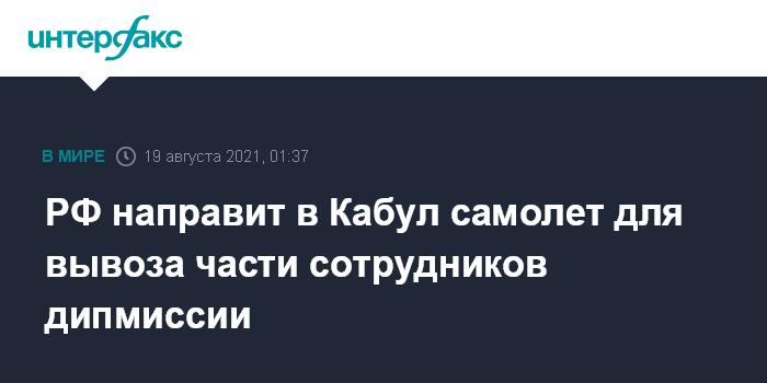 "В ближайшее время Россия планирует направить эвакуационный спецборт в Кабул - столицу Афганистана, где власть перешла к движению "Талибан" (запрещено в РФ). Самолет будет предназначен для вывоза в Москву части сотрудников российской дипмиссии, а также этнических афганцев - граждан России и обладателей разрешений на проживание в нашей стране", - говорится в публикации со ссылкой на российский и афганский дипломатические источники.