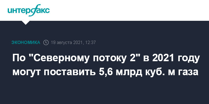 Москва. 19 августа. INTERFAX.RU - Поставки по газопроводу "Северный поток 2" в 2021 году могут составить 5,6 млрд кубометров газа, сообщил "Газпром".