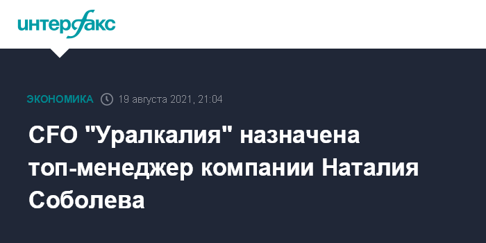 Москва. 19 августа. INTERFAX.RU - Директором по экономике и финансам "Уралкалия" назначена Наталия Соболева, сообщила компания.
