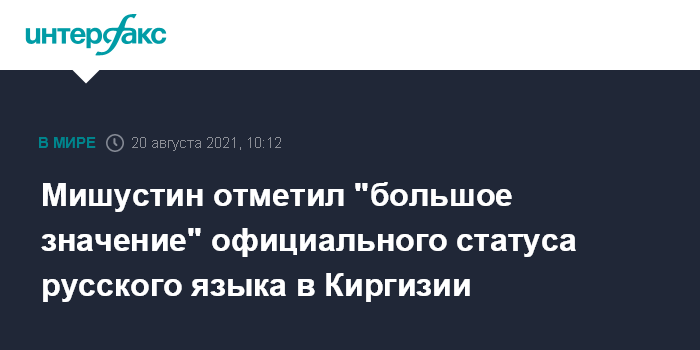 Москва. 20 августа. INTERFAX.RU - Премьер-министр РФ Михаил Мишустин на встрече с главой кабинета министров Киргизии Улугбеком Мариповым отметил большое значение официального статуса русского языка в Киргизии.