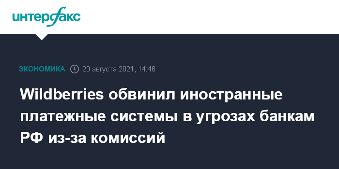 Москва. 20 августа. INTERFAX.RU - Крупнейший российский онлайн-ритейлер Wildberries заявил о незаконном давлении иностранных платежных систем на российские банки из-за решения о взимании комиссий.