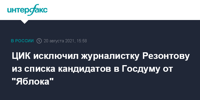 Москва. 20 августа. INTERFAX.RU - Центризбирком России принял решение исключить журналистку Наталью Резонтову из списка кандидатов от партии "Яблоко" для участия в предстоящих парламентских выборах.