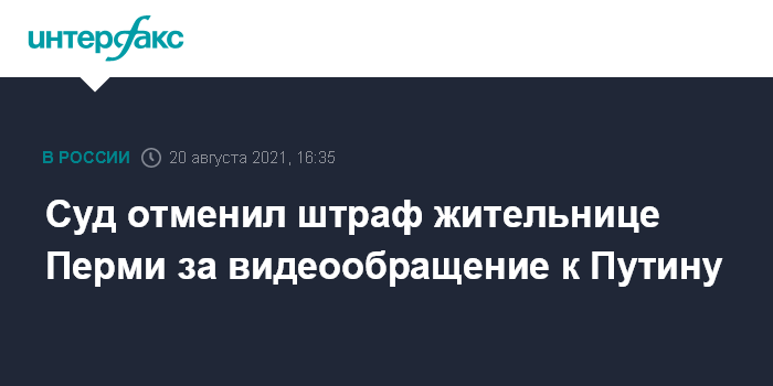 Москва. 20 августа. INTERFAX.RU - Пермский краевой суд в пятницу удовлетворил апелляционную жалобу жительницы Перми Елены Германовой, которая была оштрафована на 20 тысяч рублей после записи видеообращения на "прямую линию" с президентом Владимиром Путиным.