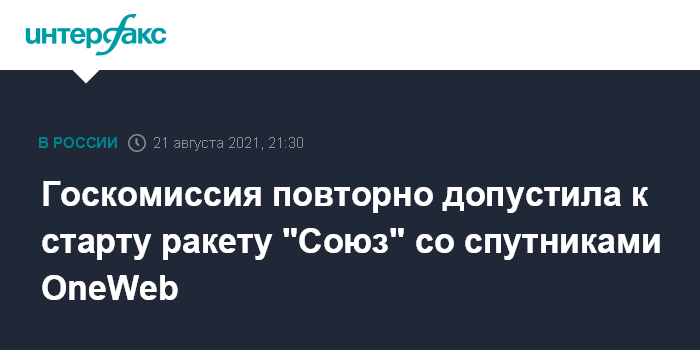 Москва. 21 августа. INTERFAX.RU - Государственная комиссия разрешила заправку ракеты-носителя "Союз-2.1б" перед запуском спутников связи OneWeb, который ранее дважды был перенесен, сообщает "Роскосмос".