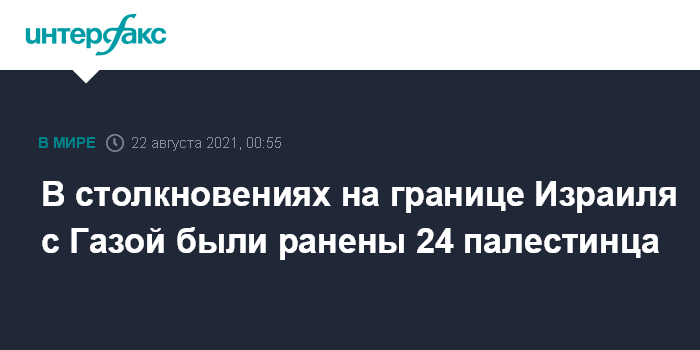 Москва. 21 августа. INTERFAX.RU - В ходе столкновений на границе Израиля с сектором Газа в субботу были ранены 24 палестинца, в том числе 13-летний мальчик. Об этом сообщает Associated Press.