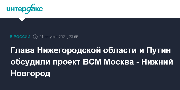 Москва. 21 августа. INTERFAX.RU - Губернатор Нижегородской области Глеб Никитин в ходе встречи с президентом России Владимиром Путиным просил вернуться к теме строительства высокоскоростной железной дороги Москва - Нижний Новгород.