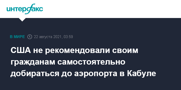 Москва. 22 августа. INTERFAX.RU - Американским гражданам в Афганистане следует воздерживаться от попыток самостоятельно добраться до столичного аэропорта из соображений "потенциальных угроз их безопасности", сообщило посольство Соединенных Штатов в Кабуле.
