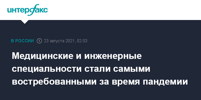 Москва. 23 августа. INTERFAX.RU - Спрос на медицинские, инженерные и педагогические специальности вырос в России на фоне пандемии COVID-19, сообщил министр науки и высшего образования РФ (Минобрнауки) Валерий Фальков в интервью, опубликованном в понедельник в газете "Известия".