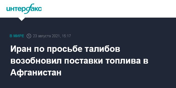Москва. 23 августа. INTERFAX.RU - Иран возобновил поставки бензина и дизельного топлива в Афганистан после получения соответствующей просьбы от движения "Талибан" (террористическая организация, запрещена в РФ). Об этом сообщает в понедельник Al Jazeera.