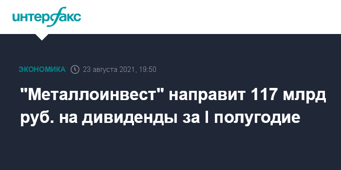 Москва. 23 августа. INTERFAX.RU - "Металлоинвест" по итогам I полугодия направит на дивиденды 117 млрд рублей, сообщила компания.