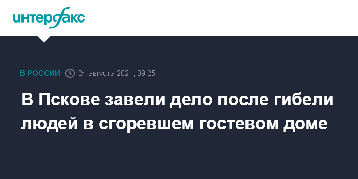 Москва. 24 августа. INTERFAX.RU - Следственные органы в Псковской области возбудили уголовное дело по факту гибели трех человек при пожаре в гостевом доме. Об этом сообщает пресс-служба регионального следственного управления СКР.