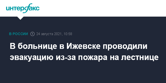 Москва. 24 августа. INTERFAX.RU - В Ижевске из городской больницы №3 эвакуировали 87 человек, в том числе 24 нетранспортабельных больных, из-за пожара на лестнице между третьим и четвертым этажами. Никто не пострадал, сообщили в пресс-службе управления МЧС по Удмуртии.