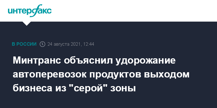 Москва. 24 августа. INTERFAX.RU - Удорожание автоперевозок продовольственных товаров связано главным образом выходом бизнеса из "серой" зоны, заявил глава Минтранса РФ Виталий Савельев.