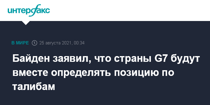 Москва. 25 августа. INTERFAX.RU - Лидеры стран G7 готовы работать над общей позицией по движению "Талибан" (запрещено в РФ), захватившему власть в Афганистане, заявил президент США Джо Байден.