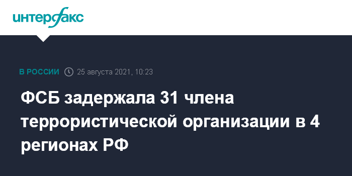 Москва. 25 августа. INTERFAX.RU - ФСБ сообщает о крупной спецоперации, в ходе которой в городах и населенных пунктах четырех регионов России задержан 31 участник запрещенной в РФ террористической организации "Катиба Таухид валь-Джихад", в том числе их главари.