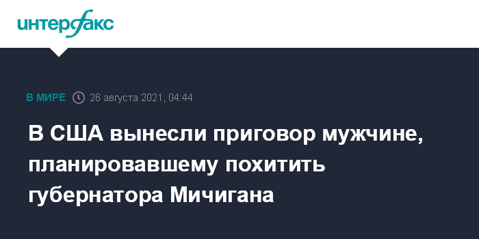Москва. 26 августа. INTERFAX.RU - Один из экстремистов, планировавших в прошлом году похищение губернатора штата Мичиган, приговорен в среду к шести годам и трем месяцам тюремного заключения, сообщает Associated Press.