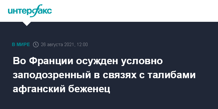 Москва. 26 августа. INTERFAX.RU - Французский суд приговорил афганского беженца к 10 месяцам лишения свободы условно за нарушение условий контроля передвижения в Париже спустя несколько дней после того, как его эвакуировали из Кабула, сообщают французские СМИ.
