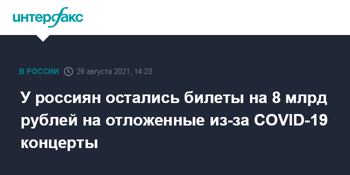 Москва. 26 августа. INTERFAX.RU - В России на руках у зрителей остается около 5 млн билетов на общую сумму почти 8 млрд рублей на концерты, отложенные из-за пандемии, сообщил глава компании Eventation, член правления ассоциации концертно-театральных и билетных организаций (КТиБО) Сергей Мурадов.
