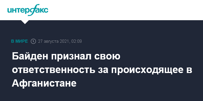 Москва. 27 августа. INTERFAX.RU - Президент США Джо Байден согласился, что несет ответственность за события в Афганистане, в том числе за гибель в результате теракта в Кабуле в четверг 12 американских военных.