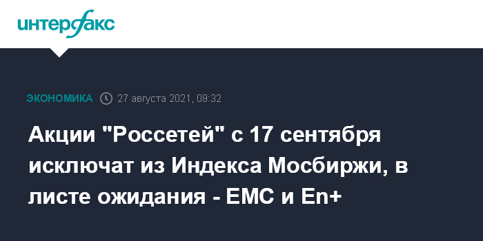 Москва. 27 августа. INTERFAX.RU - Обыкновенные акции ПАО "Россети" исключаются из базы расчета Индекса Мосбиржи и Индекса РТС с 17 сентября, говорится в сообщении торговой площадки.