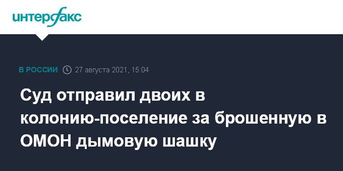 Москва. 27 августа. INTERFAX.RU - В Екатеринбурге Верх-Исетский суд назначил сроки в колонии-поселении Алексею Конькову и Кириллу Кудрину. Суд установил, что на несогласованной акции в поддержку Алексея Навального 23 января они бросили дымовую шашку в сотрудников ОМОНа.