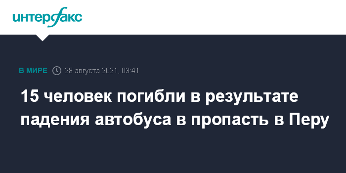 Москва. 28 августа. INTERFAX.RU - Не менее 15 человек погибли и трое получили ранения в Перуанских Андах в результате падения автобуса в пропасть, сообщает Infobae.