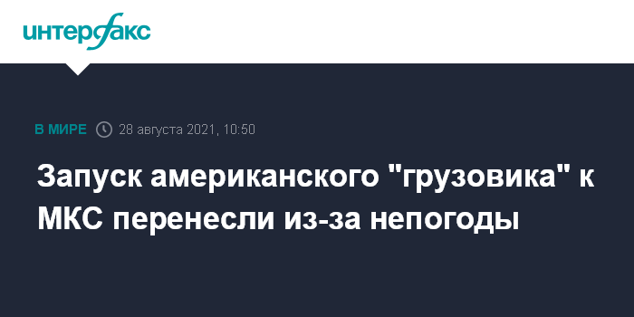 Москва. 28 августа. INTERFAX.RU - В связи с неблагоприятными погодными условиями перенесен запланированный на субботу запуск грузового космического корабля Cargo Dragon американской компании SpaceX к Международной космической станции, сообщило Национальное управление США по аэронавтике и исследованию космического пространства.