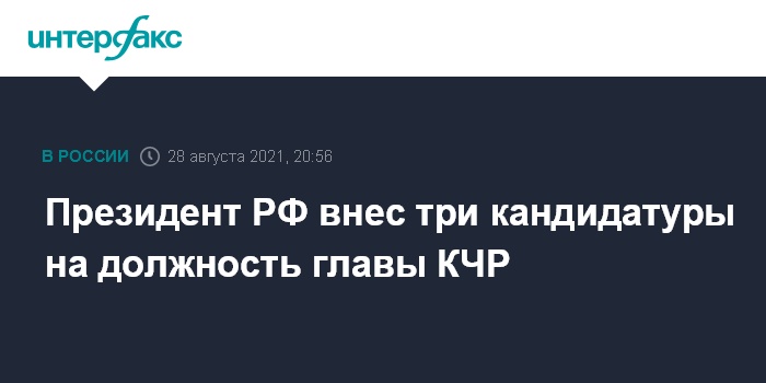 Москва. 28 августа. INTERFAX.RU - Президент России Владимир Путин внес на рассмотрение парламента Карачаево-Черкесии три кандидатуры для избрания на должность главы республики, в том числе действующего главу КЧР Рашида Темрезова.