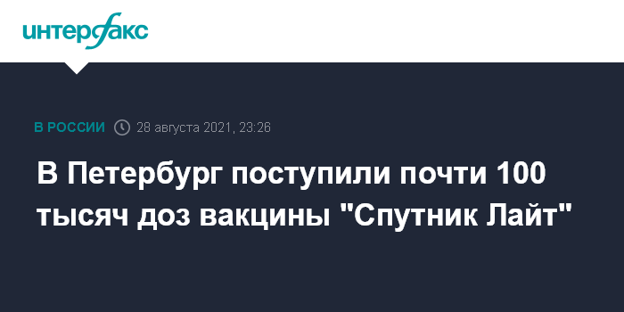 Москва. 28 августа. INTERFAX.RU - На фармбазу Петербурга в субботу поступило 97,2 тыс. доз однокомпонентной вакцины "Спутник Лайт", сообщили в пресс-службе администрации губернатора.