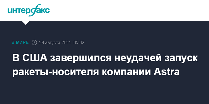 Москва. 29 августа. INTERFAX.RU - Тестовый запуск ракеты-носителя Rocket-3 в субботу, разработанной американской компанией Astra, завершился неудачей. Трансляция велась на сайте компании.