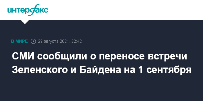 Москва. 29 августа. INTERFAX.RU - Встреча президентов Украины и США Владимира Зеленского и Джо Байдена перенесена на 1 сентября, сообщает украинская служба "Голоса Америки" (признана в РФ иноагентом).